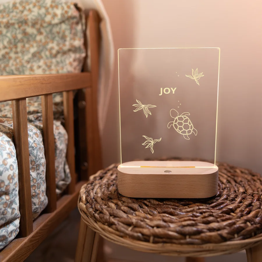 Een stijlvolle lamp met gepersonaliseerde naamgravure, perfect om de babykamer extra speciaal te maken. Een warm en persoonlijk cadeautje dat een kind meteen welkom laat voelen.